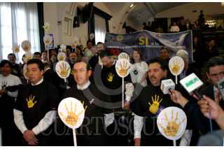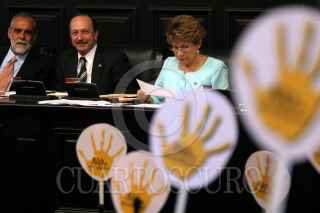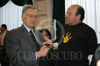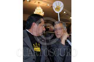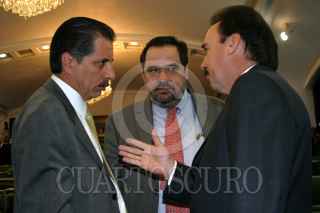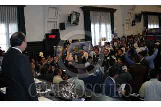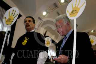 MEXICO, D.F. 06ABRIL2005.- El senador Carlos Chaurand, quien presidia la mesa directiva de la cámara alta, observa la manifestación de la bancada perredista en contra del desafuero del jefe de Gobierno capitalino, cantaron el Himno Nacional y portaron playeras con la leyenda ¨no al desafuero¨. FOTO: Sandra Perdomo/CUARTOSCURO.COM