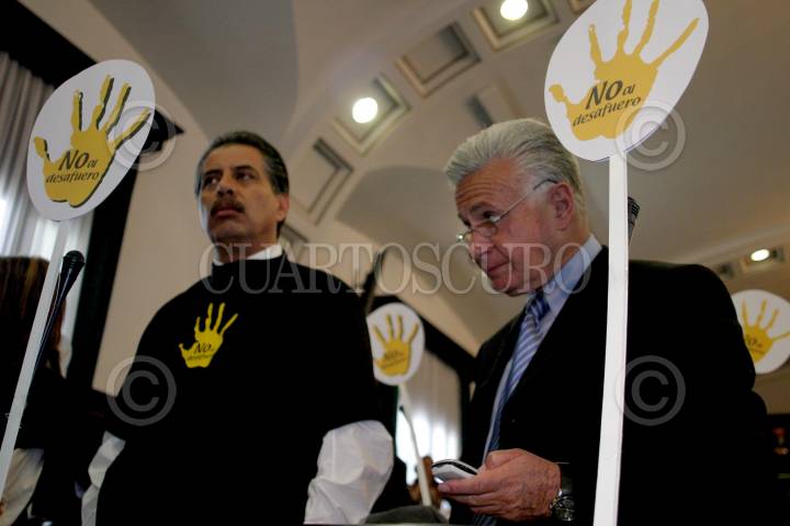 MEXICO, D.F. 06ABRIL2005.- El senador Carlos Chaurand, quien presidia la mesa directiva de la cámara alta, observa la manifestación de la bancada perredista en contra del desafuero del jefe de Gobierno capitalino, cantaron el Himno Nacional y portaron playeras con la leyenda ¨no al desafuero¨. FOTO: Sandra Perdomo/CUARTOSCURO.COM