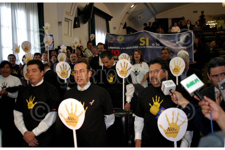 MEXICO, D.F. 06ABRIL2005.- El senador Carlos Chaurand, quien presidia la mesa directiva de la cámara alta, observa la manifestación de la bancada perredista en contra del desafuero del jefe de Gobierno capitalino, cantaron el Himno Nacional y portaron playeras con la leyenda ¨no al desafuero¨. FOTO: Sandra Perdomo/CUARTOSCURO.COM