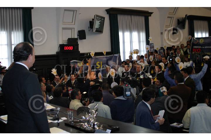 MEXICO, D.F. 06ABRIL2005.- El senador Carlos Chaurand, quien presidia la mesa directiva de la cámara alta, observa la manifestación de la bancada perredista en contra del desafuero del jefe de Gobierno capitalino, cantaron el Himno Nacional y portaron playeras con la leyenda ¨no al desafuero¨. FOTO: Sandra Perdomo/CUARTOSCURO.COM