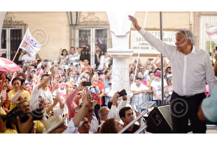 LA BARCA, JALISCO, 21MAYO2018.- Andrés Manuel López Obrador, candidato de la coalición “Juntos Haremos Historia” de los partidos Morena, PT y PES, sostuvo un encuentro con simpatizantes a su movimiento en la plaza principal de la cabecera municipal. Durante la gira por el estado lo acompaña el candidato a gobernador del estado, Carlos Lomelí Bolaños. FOTO: MISAEL VALTIERRA / CUARTOSCURO.COM