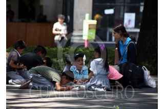 CUERNAVACA, MORELOS, 22MAYO2018.- Un grupo de niños indígenas reciben una clase en la plaza de armas de la capital. Los niños son hijos de las mujeres indígenas que venden sus artesanías ahí . FOTO: MARGARITO PÉREZ RETANA /CUARTOSCURO.COM