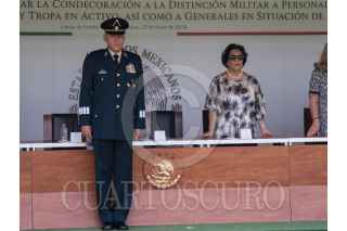 CIUDAD DE MÉXICO, 22MAYO2018.- Salvador Cienfuegos Zepeda, secretario de la Defensa Nacional, encabezó la ceremonia de Condecoración a la Distinción Militar, en la que se reconoció a 23 generales que se encuentran en la honrosa situación de retiro, además 6 generales, 3 jefes, 3 oficiales y 7 de tropa en servicio activo, siendo un total de 42 militares recompensados. FOTO: MARIO JASSO /CUARTOSCURO.COM