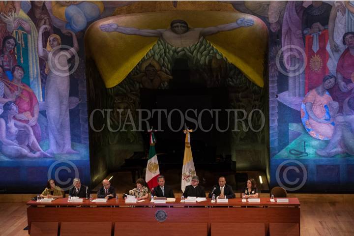 CIUDAD DE MÉXICO, 23MAYO2018.- Jorge Volpi, Coordinador de Difusión Cultura de la UNAM y María Cristina García Cepeda, de Secretaria de Cultura, durante la conferencia de prensa para la presentación de la exposición “Vaticano: de San Pedro a Francisco”. La muestra forma parte de Colecciones Vaticanas y conmemora los 25 años del establecimiento de las relaciones diplomáticas entre el Gobierno de México y la Santa Sede. FOTO: ANDREA MURCIA /CUARTOSCURO.COM