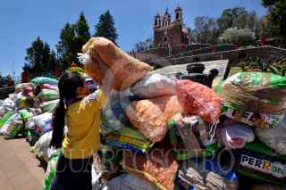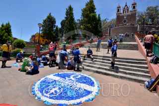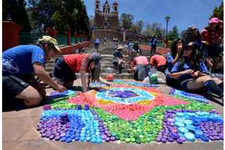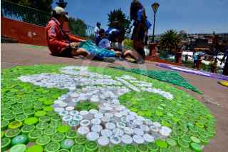 METEPEC, ESTADO DE MÉXICO, 27MAYO2018.- Por tercer año consecutivos jóvenes Scouts de Toluca de diversas edades unieron esfuerzos para ayudar a niños con cáncer, durante un año recolectaron tapas de diversos productos como parte del Tapatón 2018, en donde lograron juntar 12 toneladas de tapas, en esta ocasión tuvieron como escenario las escalinatas del Calvario en Metepec, realizando un tapete a base de tapas. FOTO: ARTEMIO GUERRA BAZ /CUARTOSCURO.COM