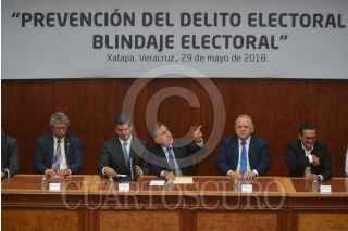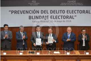 XALAPA, VERACRUZ, 29MAYO2018.- Tras una jornada de trabajo en Veracruz el titular de la FEPADE Héctor Diaz Santana realizó distintas firmas de compromisos con el OPLE,FGE y el Ejecutivo ademas de lanzar un operativo cotra delitos electorales de cara a las elecciones del 1 de julio, en el Ejecutivo signaron la firma compromiso "Prevencion del Delito Electoral y Blinaje Electoral" donde estuvieron presentes el gobernador Miguel Angel Yunes Linares autoridades del poder Judicial, Legislativo y autoridades electorales. FOTO: ALBERTO ROA /CUARTOSCURO.COM
