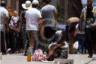 CIUDAD DE MÉXICO, 03JUNIO2018.- Un pequeño músico soporta los intensos rayos del sol en la calle de Madero, en el Centro Histórico. FOTO: MOISÉS PABLO /CUARTOSCURO.COM