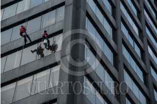 CIUDAD DE MÉXICO, 07JUNIO2018.- Dos trabajadores de limpieza realizan mantenimiento a los cristales a un edificio ubicado sobre avenida Paseo de la Reforma. FOTO: MARIO JASSO /CUARTOSCURO.COM