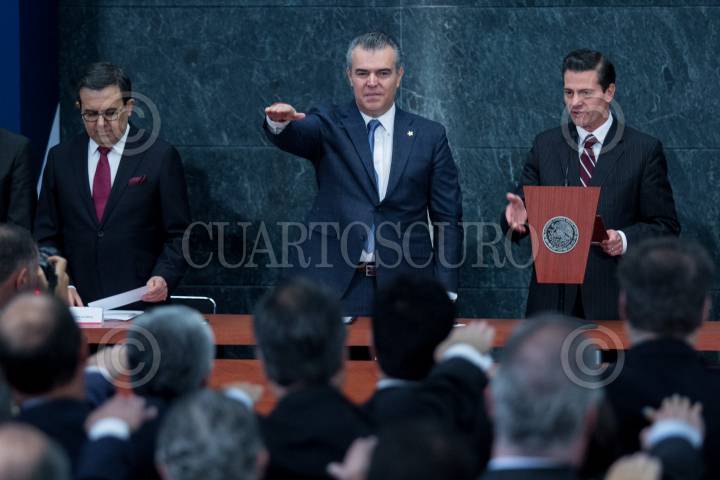 CIUDAD DE MÉXICO, 07JUNIO2018.- César Alberto Martínez Baranda, director general del Infonacot; Gerardo Gutierrez Candiani, titular de Zonas Económicas Especiales; Bosco de la Vega, presidente del Consejo Nacional Agropecuario (CNA); José Manuel López Campos, presidente de la Confederación Nacional de Cámaras de Comercio (Concanaco), y el presidente Enrique Peña Nieto, durante la toma de protesta de Francisco Cervantes Díaz, presidente entrante de la Confederación de Cámaras Industriales (CONCAMIN), en la residencia oficial de los Pinos. FOTO: GALO CAÑAS /CUARTOSCURO.COM