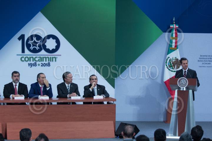 CIUDAD DE MÉXICO, 07JUNIO2018.- César Alberto Martínez Baranda, director general del Infonacot; Gerardo Gutierrez Candiani, titular de Zonas Económicas Especiales; Bosco de la Vega, presidente del Consejo Nacional Agropecuario (CNA); José Manuel López Campos, presidente de la Confederación Nacional de Cámaras de Comercio (Concanaco), y el presidente Enrique Peña Nieto, durante la toma de protesta de Francisco Cervantes Díaz, presidente entrante de la Confederación de Cámaras Industriales (CONCAMIN), en la residencia oficial de los Pinos. FOTO: GALO CAÑAS /CUARTOSCURO.COM