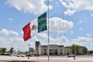 PIEDRAS NEGRAS, COAHUILA, 09JUNIO2018.- La bandera de la explanada municipal lució a media asta por el asesinato de Fernando Purón, candidato del PRI a diputado federal, quien recibió un balazo en la cabeza la noche de ayer al salir de un debate en la Universidad Autónoma de Coahuila. FOTO: CUARTOSCURO.COM