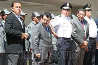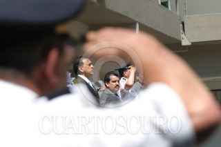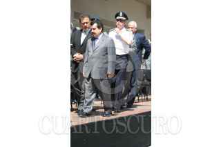 MEXICO, D.F. 25ABRIL2005.- El sub secretario de la SSP y el titular de la SSP, Manuel Ángel Yunez y Ramón Martín Huerta, durante la toma de protesta de nuevos elementos de la PFP. El almirante Tomás Valencia la derecha de la imagen. FOTO: Sandra Perdomo/CUARTOSCURO.COM