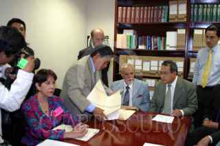 MEXICO, D.F. 26ABRIL2005.- El abogado Raúl Carranca Rivas, entregó al director jurídico de la Cámara de diputados, Roberto Sánchez, una demanda para realizar jucio político a los diputados que votaron a favor del desafuero de López Obrador el pasado 7 de abril. FOTO: Sandra Perdomo/CUARTOSCURO.COM