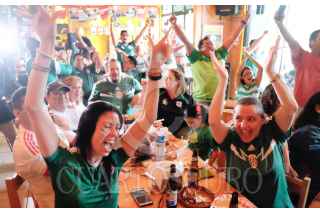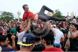 CANCÚN , QUINTANA ROO, 17JUNIO2018.- La afición mexicana se reunió en restaurantes y plazas públicas para observar el partido México vs Alemania de la Copa del Mundo Rusia 2018, en el cual los tricolores se alzaron con la victoria 1-0, con gol del "Chucky" Lozano. Tras el pitazo final los aficionados estallaron en jubilo ya que con esta victoria el seleccionado nacional suma sus primeros tres puntos en la justa mundialista, además de conseguir un resultado histórico ya que jamás se le había ganado a los teutones. FOTO: ELIZABETH RUIZ /CUARTOSCURO.COM
