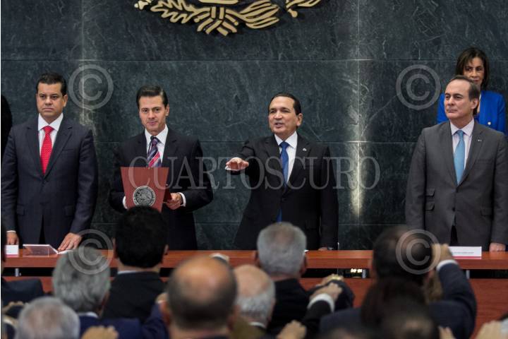 CIUDAD DE MÉXICO, 20JUNIO2018.- Edgar Romo García, presidente de la Mesa Directiva de la Cámara de Diputados; Rolando Rodrigo Zapata Bello, gobernador del estado de Yucatán; Enrique Peña Nieto, presidente de la República, y José Manuel López Campos, nuevo presidente de la Confederación de Cámaras Nacionales de Comercio, Servicios y Turismo (Concanaco-Servytur), durante la toma de protesta de López Campos. FOTO: GALO CAÑAS /CUARTOSCURO.COM