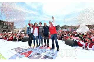 TOLUCA, ESTADO DE MÉXICO, 24JUNIO2018.- José Antonio Meade Kuribreña, candidato a la Presidencia de la República por la coalición "Todos por México", encabezó su cierre regional de campaña en el centro de la capital mexiquense. En la imagen lo acompañan su esposa Juana Cuevas, su padre Dionisio Meade, y sus hijos. FOTO: CUARTOSCURO.COM