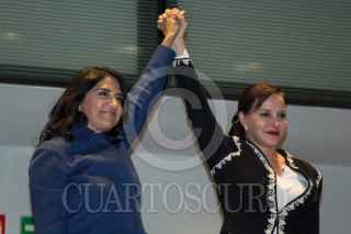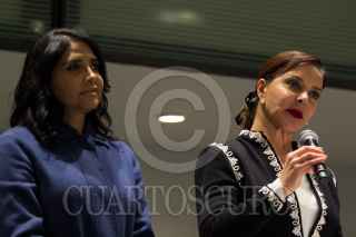 CIUDAD DE MÉXICO, 26JUNIO2018.- Alejandra Barrales, candidata a la jefatura de gobierno por la coalición “Por la CDMX al Frente”, y Purificación Carpinteyro, candidata por el partido Nueva Alianza, ofrecieron una segunda conferencia posterior a la reunión que realizaron durante la tarde. Las candidatas firmaron el decálogo para la felicidad, propuesta que engloba desde la seguridad de los capitalinos hasta las penas por maltrato animal en la capital del país. Carpinteyro Calderón dejó en claro que esta no era una declinación en favor de ex presidenta nacional del PRD, sin embargo llamó a sus simpatizantes a hacer uso del voto útil y dárselo a Barrales Magdaleno, a quién destacó como la más preparada para ocupar el cargo. De igual modo, la candidata del azul turquesa declaró que esta decisión es de índole personal y que no consultó al partido antes de realizar esta firma. FOTO: GALO CAÑAS /CUARTOSCURO.COM