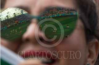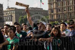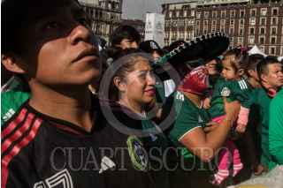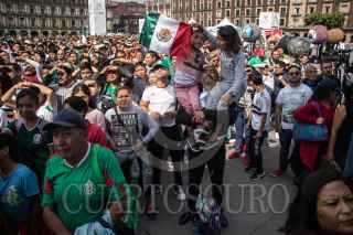 CIUDAD DE MÉXICO, 27JUNIO2018.- Aficionados mexicanos se dieron cita en la plancha del Zócalo capitalino para apreciar el tercer partido de la Selección Mexicana en contra de Suecia. En un principio la afición se mostraban con mucho animo, pero pronto los momentos se volvieron tensos y tristes, hasta los últimos minutos del encuentro cuando a pesar de la derrota 3 goles por cero, el publicó conoció el marcador de dos goles por cero del equipo coreano sobre el alemán, explotó la felicidad en los mexicanos concentrados. FOTO: ADOLFO VLADIMIR /CUARTOSCURO.COM