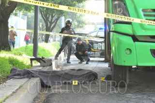 CIUDAD DE MÉXICO, 27JUNIO2018.- Un intento de asalto a un vehículo de transporte de pasajeros dejó como saldo un presunto delincuente muerto en el Anillo Periférico sur en la zona de Cuemanco, delegación Xochimilco. El incidente se desarrolló en el interior de un autobús de la Ruta 50, que presta el servicio de trasporte del pueblo de Mixquic delegación Tláhuac a la estación del Metro General Anaya. Un usuario del trasporte de pasajeros; al aprovechar la distracción de uno de los tres asaltantes sacó de entre sus ropas el arma de fuego que portaba y enfrento a los presuntos delincuentes. Al lugar llegó su supuesta esposa quien indicó que el hombre asesinado era vendedor de dulces. FOTO: ARMANDO MONROY /CUARTOSCURO.COM