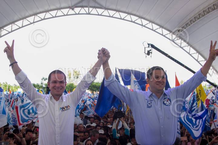 LEÓN, GUANAJUATO, 27JUNIO2018.- Ricardo Anaya Cortés, candidato a la presidencia de la República por la coalición "Por México al Frente" realizó su cierre de campaña en la Mega Velaria del estado. Acompañado del candidato a la gubernatura del estado, Diego Sinhue y del candidato a presidente municipal Héctor López Santillana. FOTO: GALO CAÑAS /CUARTOSCURO.COM