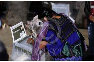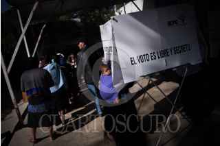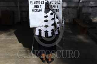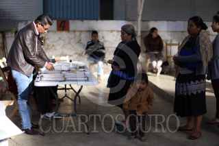 SAN CRISTOBAL DE LAS CASAS, CHIAPAS, 01JULIO2018.- Al rededor de 150 mujeres y hombres tsosiles desplazados del municipio de Chenalhó votaron en una casilla especial, dentro del campamento en el que se encuentra desde el 26 de mayo de 2016. Después de una disputa poselectoral por la presidencia municipal, este grupo de 250 personas salió del ejido Puebla tras el hostigamiento de un grupo paramilitar. El Instituto Nacional Electoral ordenó la instalación de esta casilla especial después de la solicitud de la comunidad, del Centro de Derechos Humanos Ku’untik, la Comisión Nacional de de Derechos Humanos y la ONU. FOTO: PEDRO ANZA /CUARTOSCURO.COM