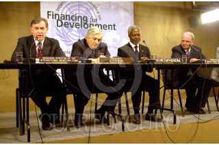 ONU. Conferencia de Financiación para el Desarrollo. Ante decenas de periodistas, Kofi Annan, acompañado de los presidente del FMI y del Banco Mundial asi como del encargado del encuentro, en la sede de Cintermex. FOTO: Pedro Valtierra/CUARTOSCURO.COM