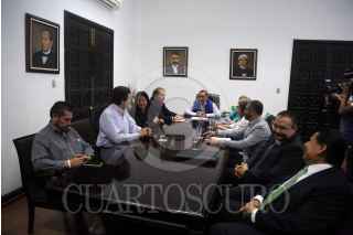 CUERNAVACA, MORELOS, 04julio2018. - Reunión entre Ángel Colin Nava, secretario de gobierno y la comisión de enlace que designo el virtual gobernador Cuauhtémoc Blanco Bravo. La comitiva estuvo integrada por José Manuel Sanz Rivera, secretario técnico del ayuntamiento y manager del ex futbolista, el tesorero Alejandro Villareal, el secretario general del ayuntamiento, Samuel Sotelo, el abogado Cipriano Sotelo y Mirna Zavala contralora. FOTO: MARGARITO PÉREZ RETANA /CUARTOSCURO.COM