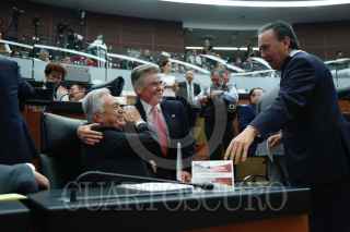 CIUDAD DE MÉXICO, 04JULIO2018.- El senador petista Manuel Bartlett recibe felicitaciones de los senadores priistas Enrique Burgos y Emilio Gamboa Patrón, durante la sesión de la Comisión Permanente. FOTO: CUARTOSCURO.COM