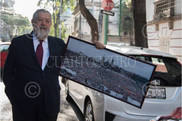 CIUDAD DE MÉXICO, 05JULIO2018.- Armando Guadiana, candidato candidato a senador por la coalición 'Juntos Haremos Historia' en Coahuila, acudió esta mañana a visitar la casa de campaña de Andrés Manuel López Obrador. En su salida posó ante los medios de comunicación con una fotografía del zócalo capitalino. FOTO: MARIO JASSO /CUARTOSCURO.COM