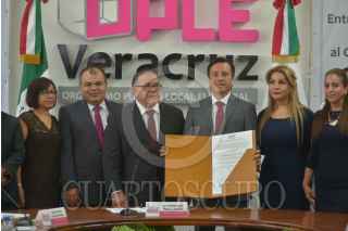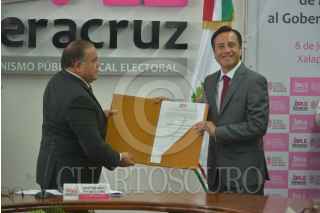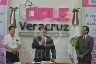 XALAPA, VERACRUZ, 08JULIO2018.- Miembros del Organismo Público Local Electoral, entregaron la constancia a gobernador electo de Veracruz a Cuitláhuac García Jiménez candidato de Morena. FOTO: ALBERTO ROA /CUARTOSCURO.COM