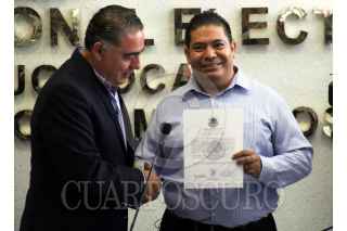 CUERNAVACA, MORELOS, 08JULIO2018.- El consejero presidente de la Junta Local Ejecutiva del Instituto Nacional Electoral, Pablo Sergio Aispuro entrega la constancia de mayoría al senador electo de la coalición Juntos Haremos Historia (MORENA, PT y PSD), Radames Salazar Solorio. FOTO: MARGARITO PÉREZ RETANA /CUARTOSCURO.COM
