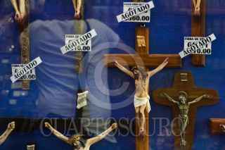 CIUDAD DE MÉXICO, 08JULIO2018.- Cientos de modelos de imágenes religiosas se venden dentro de la Basílica de Guadalupe, en la imagen el aparador de una de estas tiendas en donde varios modelos de crucifijo están agotados. FOTO: MOISÉS PABLO /CUARTOSCURO.COM