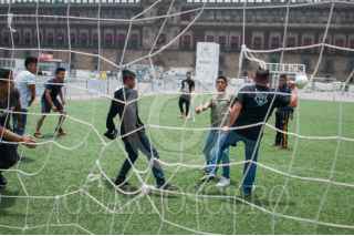 CIUDAD DE MÉXICO, 11JULIO2018.- Jovenes juegan un partido de fútbol en una cancha sintética instalada sobre el zócalo capitalino en el marco del mundial Rusia 2018. FOTO: DIEGO SIMÓN SÁNCHEZ /CUARTOSCURO.COM
