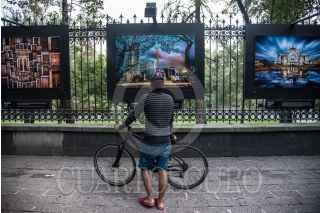 CIUDAD DE MÉXICO, 18JULIO2018.- Un ciclista observa una fotogradía de una exposición ubicada en las "Rejas de Chapultepec" sobre avenida Paseo de la Reforma. FOTO: MARIO JASSO /CUARTOSCURO.COM