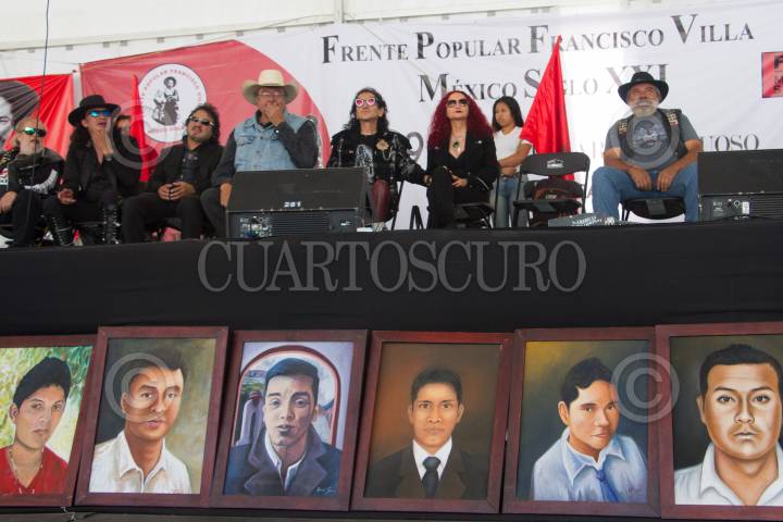CIUDAD DE MÉXICO, 20JULIO2018.- Integrantes del Frente Popular Francisco Villa, encabezados por Agustín Villa bisnieto del centauro del norte, realizaron evento en el que le entregaron un reconocimiento al grupo de Rock TRI, por su 50 años de trayectoria artística. El evento tuvo lugar en el monumento a la Revolución. FOTO: VICTORIA VALTIERRA /CUARTOSCURO.COM