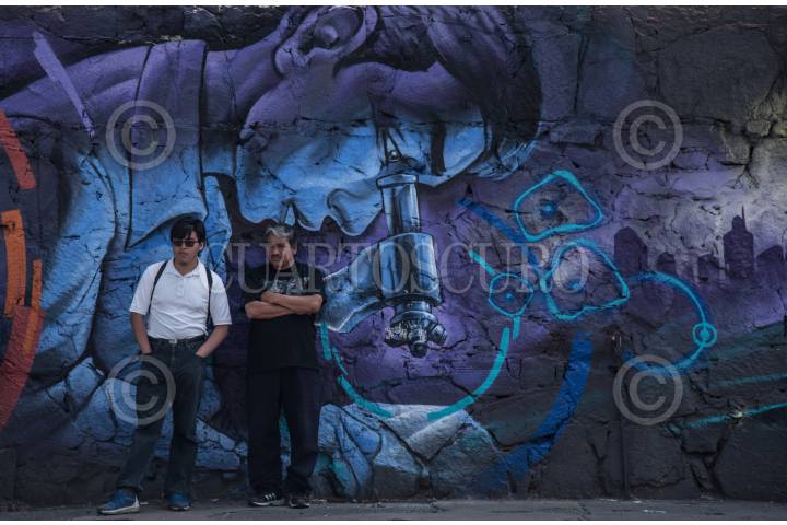 CIUDAD DE MÉXICO, 21JULIO2018.- Un padre y su hijo esperan el inicio de una marcha estudiantil recargados en un mural ubicado sobre la avenida Colector 13 en Lindavista. FOTO: MARIO JASSO /CUARTOSCURO.COM