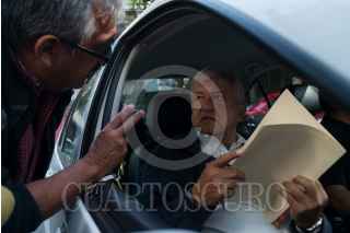 CIUDAD DE MÉXICO, 22JULIO2018.- Andrés Manuel López Obrador, virtual ganador de la eleciones presidenciales, arribó desde temprana hora a su casa de campaña ubicada en la colonia Roma; dónde ya lo esperaban simpatizantes con cartas de peticiones, felicitaciones y currículums, los cuales el morenista atendió desde su auto. FOTO: ANDREA MURCIA /CUARTOSCURO.COM