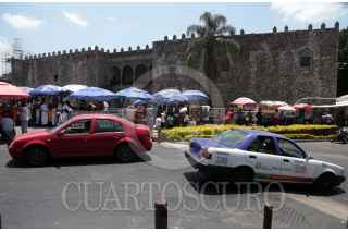 CUERNAVACA, MORELOS, 24JULIO2018.- La plaza frente al Palacio de Cortes se encuentra llena de sombrillas de comerciantes informales, impidiendo la vista general del monumento histórico. FOTO: MARGARITO PÉREZ RETANA /CUARTOSCURO.COM