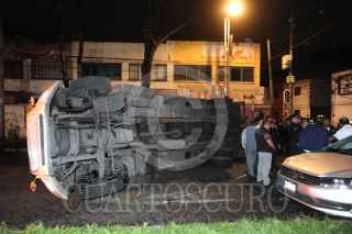 CIUDAD DE MÉXICO., 28JULIO2018.- Un camión de carga tipo torton, volcó al ser impactado por un auto Renault, cuando este huía por haber golpeado a varios autos antes y una ambulancia, sobre Cuitláhuac a la altura de Mar Mediterráneo en la colonia Popotla. El conductor ebrio, fue detenido. FOTO: LUIS CARBAYO /CUARTOSCURO.COM