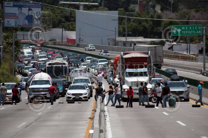 CUERNAVACA, MORELOS, 29JULIO2018.- Vecinos del pueblo de Acapantzingo mantienen bloqueado los cinco carriles del paso exprés en dirección al sur. Protestan por la detención de un joven oriundo de ahí, que ayer se defendió de un asalto en una tienda de convivencia y al forcejear con el ladrón lo hirió de muerte, según los vecinos, fue en defensa propia. El bloqueo genera molestar en los turistas que se dirigen al puerto de Acapulco. FOTO: MARGARITO PÉREZ RETANA /CUARTOSCURO.COM
