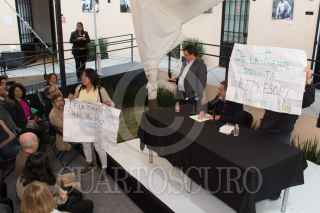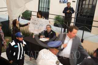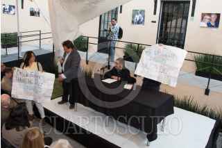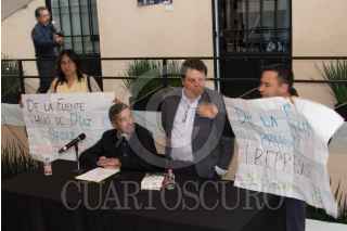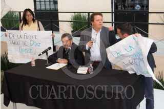 CIUDAD DE MÉXICO, 31JULIO2018.- Un par de jóvenes protestaron contra el ex rector de la UNAM y el designado por Andrés Manuel López Obrador para ocupar el cargo de embajador de la ONU, Juan Ramón de la Fuente, durante el ciclo de foros a 50 años de Tlateloco organizado por la fundación Elena Poniatowska Amor. FOTO: SAÚL LÓPEZ /CUARTOSCURO.COM