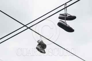 CIUDAD DE MÉXICO, 02AGOSTO2018.- Es muy común encontrar diversos tipos de calzados colgando en los cables de las líneas telefónicas de toda la Ciudad de México. FOTO: MISAEL VALTIERRA / CUARTOSCURO.COM