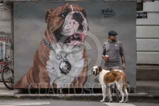 CIUDAD DE MÉXICO, 04AGOSTO2018.- Frente a pintura de un bulldog un hombre pasea a su perro sobre la avenida Álvaro Obregón de la colonia Roma. FOTO: ADOLFO VLADIMIR /CUARTOSCURO.COM