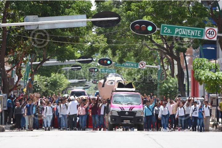 TUXTLA GUTIÉRREZ, CHIAPAS, 06AGOSTO2018.- Estudiantes de la Escuela Normal Rural Mactumatzá, marcharon en la capital chiapaneca para recordar la represión que sufrieron hace 15 años por parte del gobierno del estado. Al final del mitin político prendieron fuego a un monigote que representa la imagen del ex gobernador de Chiapas durante el período 2000-2006 Pablo Salazar Mendiguchía. Fue puesto al centro de la Plaza Central donde fue exhibido al público. FOTO: JACOB GARCÍA / CUARTOSCURO.COM