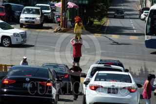 CUERNAVACA, MORELOS, 10AGOSTO2018.-Dos jóvenes y un niño realizan un acto de malabarismo en el crucero de Teopanzolco en la capital para ganarse unos pesos. FOTO: MARGARITO PÉREZ RETANA /CUARTOSCURO.COM