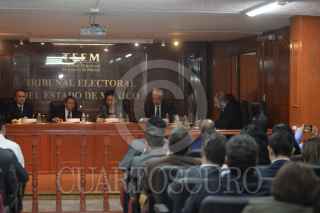 TOLUCA ESTADO DE MÉXICO, 10AGOSTO2018.- Magistrados del Tribunal Electoral del Estado de México durante sesión resolvieron quitar a MORENA las 10 diputaciones de Representación Proporcional que el IEEM le había otorgado, bajo el argumento de que estaba sobrerepresentado. FOTO: ARTEMIO GUERRA BAZ /CUARTOSCURO.COM