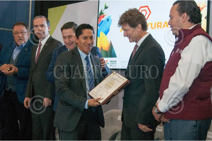 CIUDAD DE MÉXICO, 14AGOSTO2018.- Baltazar Hiojosa Ochoa, titular de SAGARPA; y Enrique de la Madrid, secretario de Turismo, encabezaron la ceremonia de entrega de Certificados Halal para Empresas Agroalimentarias Mexicanas, como parte de las actividades del "México Alimentaria: Food Show 2018", llevado a cabo en un importante centro de convenciones de la capital. FOTO: MARIO JASSO / CUARTOSCURO.COM