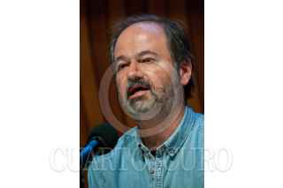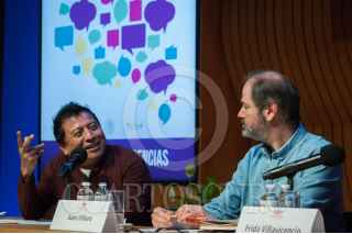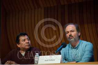 CIUDAD DE MÉXICO, 14AGOSTO2018.- El comunicador y poeta náhuatl, Mardonio Carballo, y el escritor Juan Villoro, ofrecieron la conferencia "Lenguas Indígenas y medios de comunicación", en el marco del Ciclo ¿Quiénes Somos Los Mexicanos? Diálogos en la Multiculturalidad, en la sede del Colegio Nacional. FOTO: DIEGO SIMÓN SÁNCHEZ / CUARTOSCURO.COM