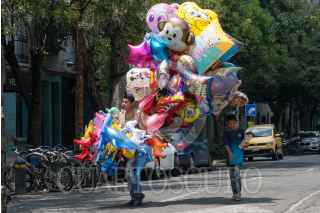 CIUDAD DE MÉXICO, 19AGOSTO2018.- Padre e hijo caminan por las calles de la colonia Roma vendiendo globos con gas helio, entre otros artículos. FOTO: ANDREA MURCIA /CUARTOSCURO.COM