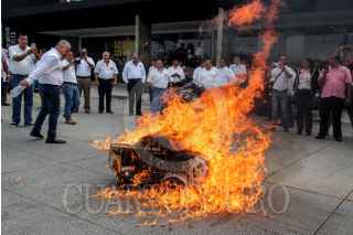 XALAPA, VERACRUZ., 21AGOSTO2018.- Taxistas de la zona conurbada Veracruz- Boca del Rio marcharon y quemaron simbólicamente un UBER de cartón como protesta ante la posible entrada de esta modalidad de transporte publico privado en la capital del estado. FOTO: ALBERTO ROA /CUARTOSCURO.COM
